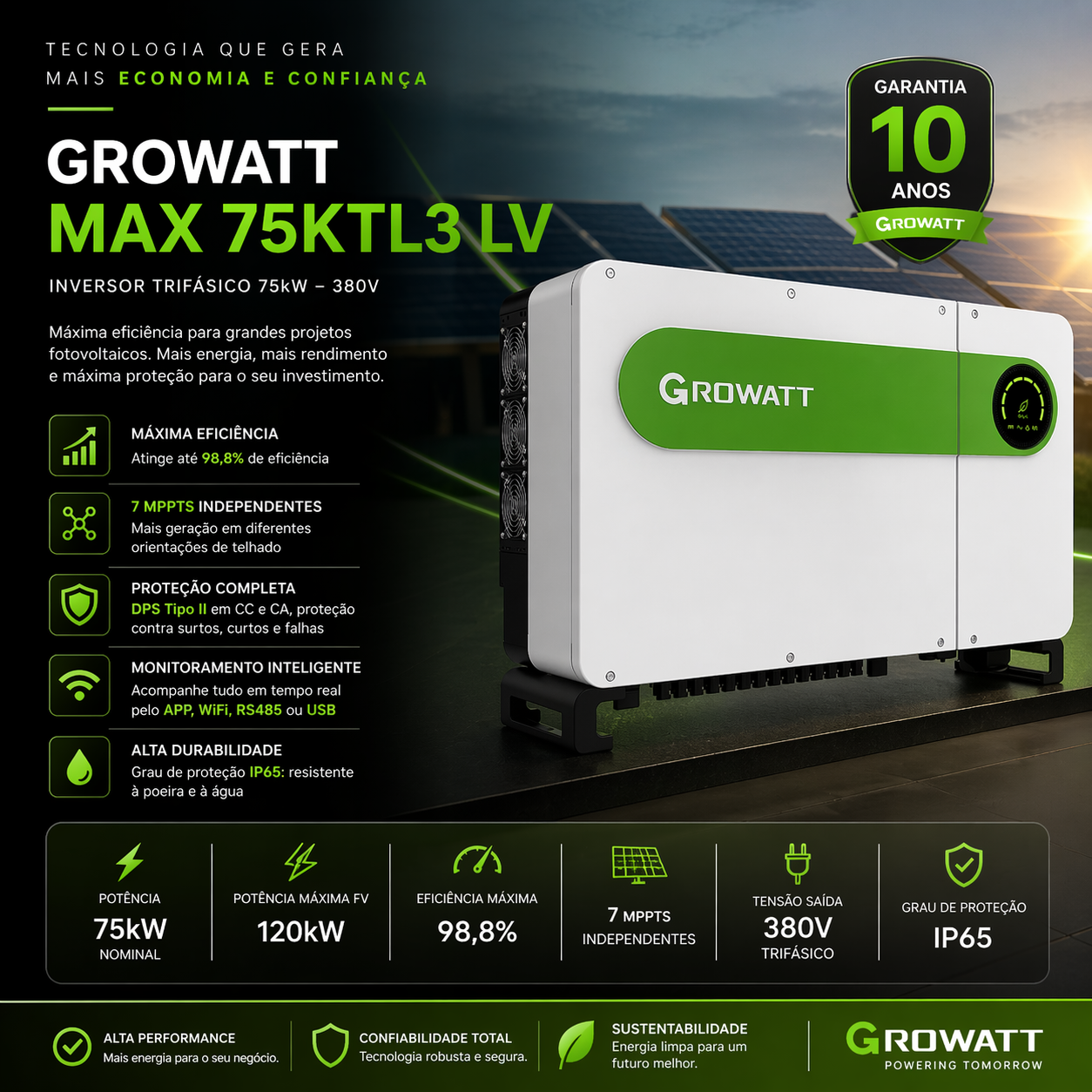 O Growatt MAX 75KTL3 LV é um inversor solar trifásico de alta potência, desenvolvido para sistemas fotovoltaicos comerciais e industriais que exigem máxima eficiência, confiabilidade e excelente desempenho energético. Com 75kW de potência nominal, 7 MPPTs independentes e eficiência máxima de 98,8%, este modelo é ideal para usinas solares em empresas, galpões, fazendas e grandes instalações.