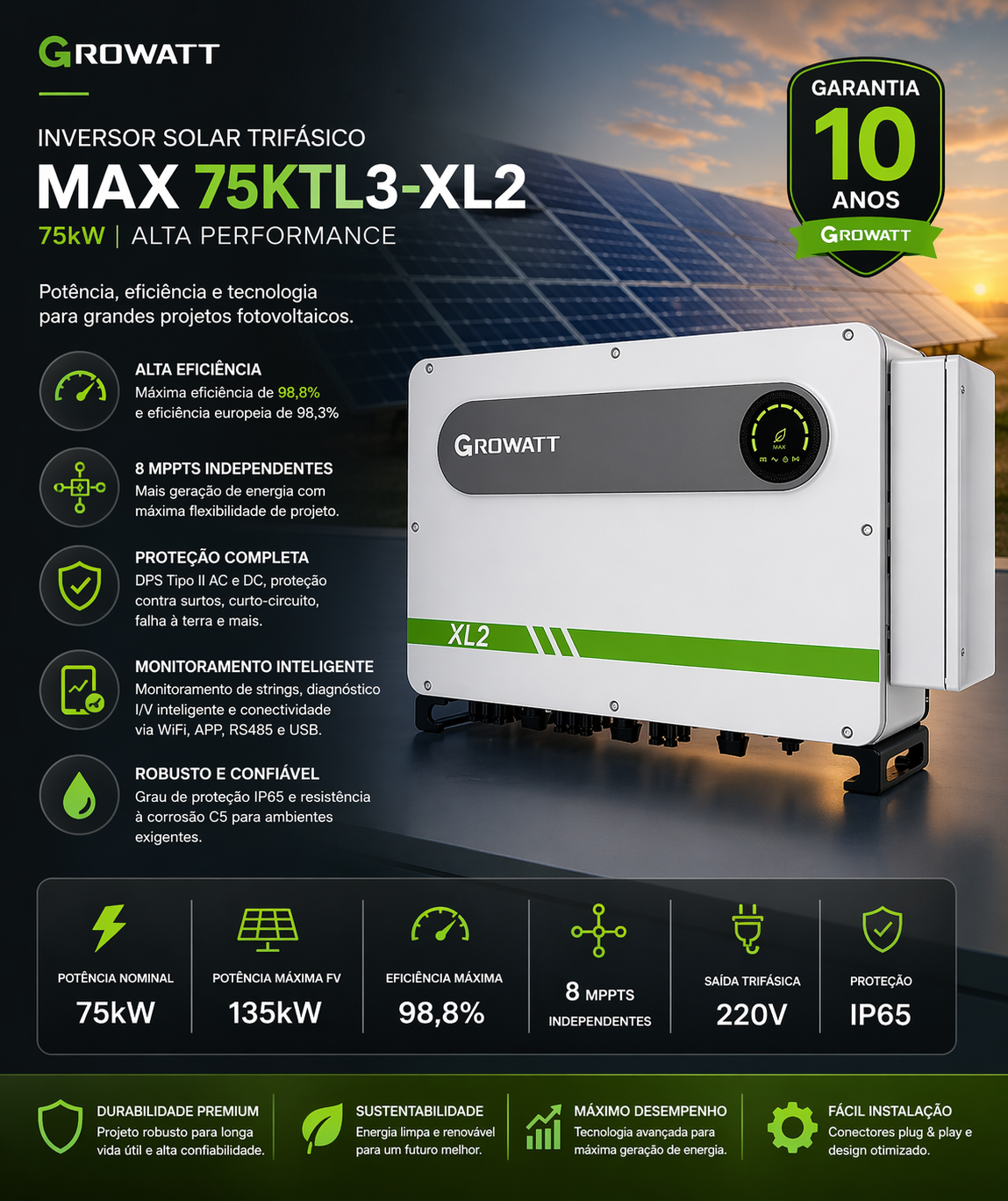 O Growatt MAX 75KTL3-XL2 75kW é a escolha ideal para quem busca alto rendimento, segurança e confiabilidade em grandes projetos fotovoltaicos. Aproveite agora!