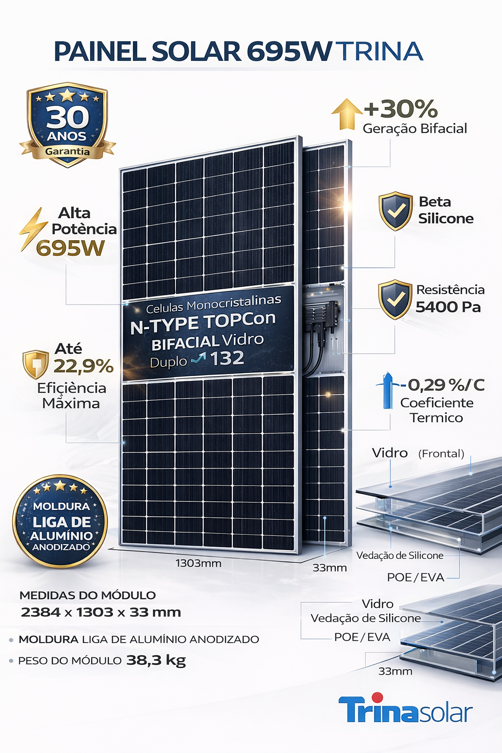 ✔ Alta potência de 695W – mais energia gerada por módulo