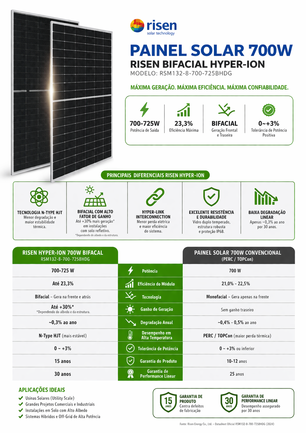 Invista no Painel Solar 700 W Risen Bifacial Hyper-Ion e maximize a geração de energia do seu projeto com uma tecnologia avançada e confiável, ideal para grandes sistemas solares no Brasil.